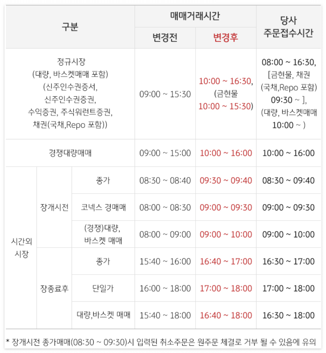 투자자 여러분께서는 매매에 차질이 없도록 변경된 시간을 확인하시기 바랍니다.